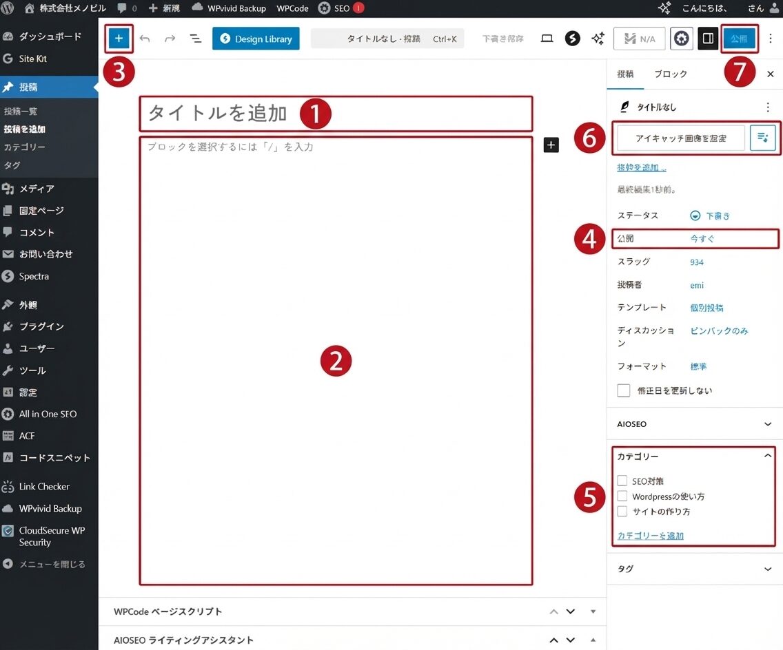 WordPressの管理画面から「投稿」→「新規追加」をクリックすると、以下の投稿画面が表示されます。各エリアの役割を番号順に解説します。
